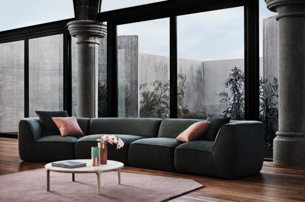 Named after a small town in New South Wales with soft, rolling green hills, Sofala is an inviting modular sofa, characterised by its smooth curves and versatile modules that allow for a range of comfortable configurations. With distinctive piping detail and a welcoming aesthetic, Sofala is suitable for both commercial and residential environments. First launched at DENFAIR 2018, the re-imagined Sofala returns with a new 150-degree corner module, allowing for a wider range of formations, upholstered in Mokum Topiary.